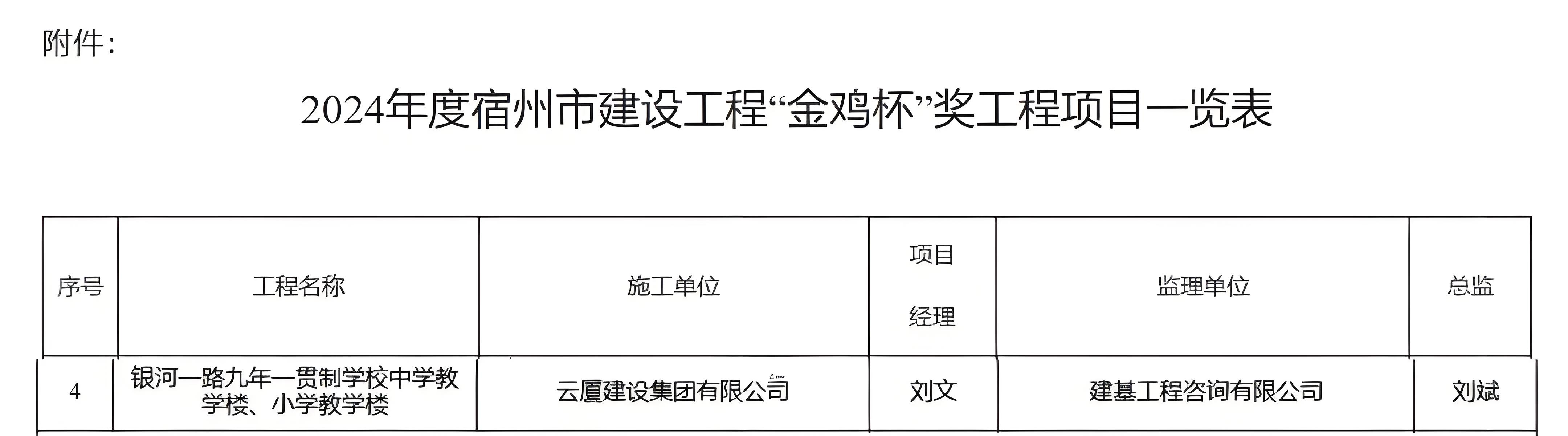 近日,由公司監理的銀河一路九年一貫制學校中學教學樓、小學教學樓項目,榮獲2024年度宿州市建設工程"金雞杯"獎(市優質工程),項目總監理工程師劉斌同志獲評"優秀總監理工程師"稱號。