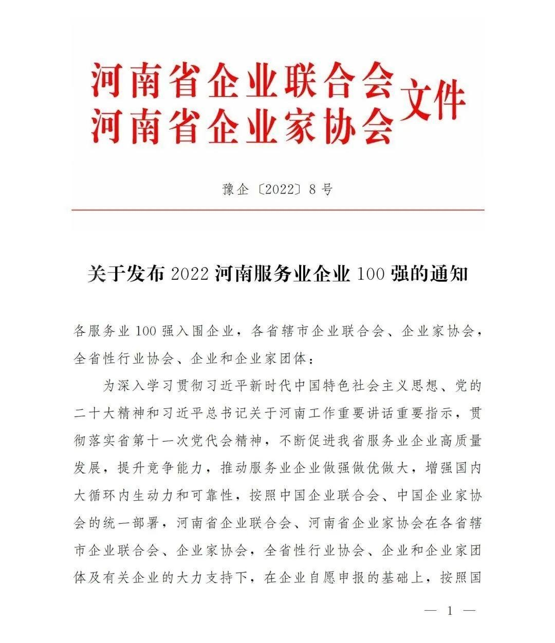 此次百強企業榜單發布,旨在進一步弘揚企業家精神,更好發揮龍頭領跑示范帶動作用,助推經濟社會高質量發展。本次榮膺“河南服務業企業100強”是對公司快速發展的充分肯定,也凝聚著建基人的汗水與心血,激勵著我們繼續前行。