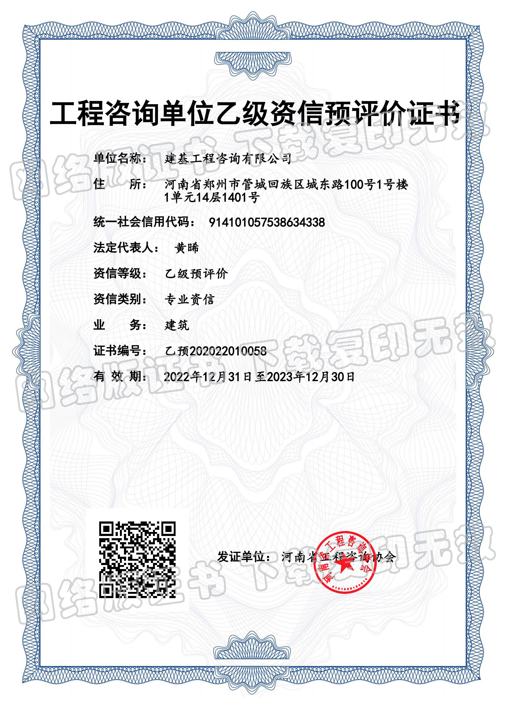 近日,公司資質(zhì)升級(jí)工作再傳喜訊,經(jīng)河南省工程咨詢協(xié)會(huì)批準(zhǔn),公司榮獲“工程咨詢單位(建筑)乙級(jí)資信預(yù)評(píng)價(jià)證書”。目前,公司已經(jīng)具有工程監(jiān)理綜合資質(zhì)(涵蓋公路工程、水利水電工程、港口與航道工程、農(nóng)林工程、 建筑工程、市政公用工程、機(jī)電安裝工程、民航工程、鐵路工程、電力工程、通信工程、冶金工程、礦山工程、石油化工工程);建筑工程設(shè)計(jì)甲級(jí);工程造價(jià)咨詢甲級(jí);政府采購招標(biāo)代理、建設(shè)工程招標(biāo)代理;水利工程施工監(jiān)理乙級(jí)、人防工程監(jiān)理乙級(jí)、市政行業(yè)設(shè)計(jì)乙級(jí)、市政行業(yè)(橋梁工程)專業(yè)設(shè)計(jì)乙級(jí)、市政行業(yè)(道路工程)專業(yè)設(shè)計(jì)乙級(jí)、建筑行業(yè)(人防工程)專業(yè)設(shè)計(jì)乙級(jí)、商物糧行業(yè)批發(fā)配送與物流倉儲(chǔ)工程專業(yè)設(shè)計(jì)乙級(jí)、風(fēng)景園林景觀設(shè)計(jì)乙級(jí)等多種資質(zhì)。