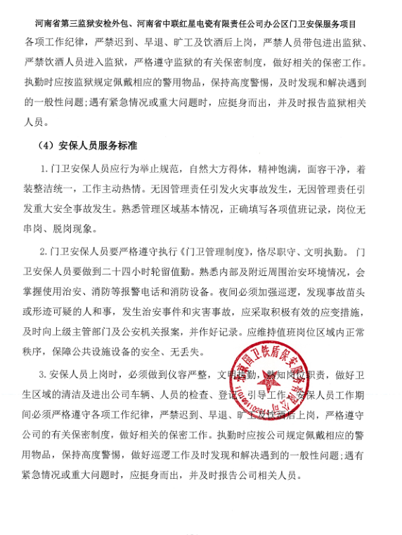 一、項目名稱:河南省第三監獄安檢外包、河南省中聯紅星電瓷有限責任公司辦公區門衛安保服務項目