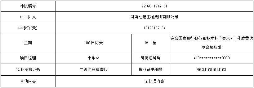 經招標人確定,現將該項目鄭州市管城回族區天福路(祥瑞路-建武路)道路工程項目(標段編號:22-GC-1247-01)的中標結果公告如下: