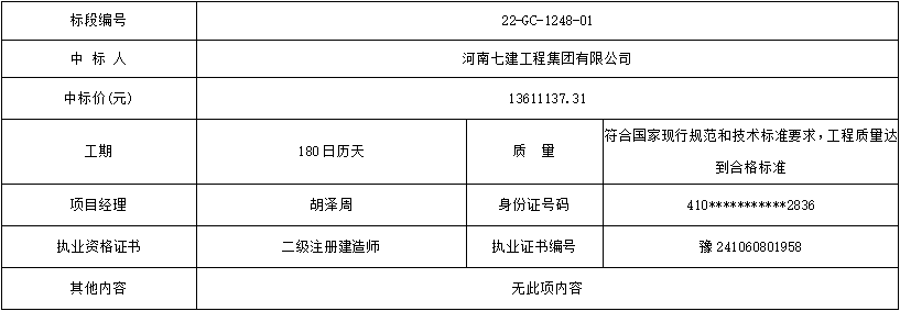 經(jīng)招標人確定,現(xiàn)將該項目鄭州市管城回族區(qū)建武路(天福路-潯江西路)道路工程項目(標段編號:22-GC-1248-01)的中標結(jié)果公告如下: